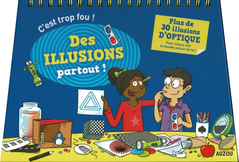 ISBN 978-2-0178-5993-2, “Illusions d’Optique”, Laurence Féraud en Matthieu Roda, Deux Coqs d’Or, 2019, experimenteer box met een instructie- en informatieboek, 16 pagina’s en 3D-bril. Afgebeeld zijn de voorzijden van de box en van het bijbehorende instructieboek.