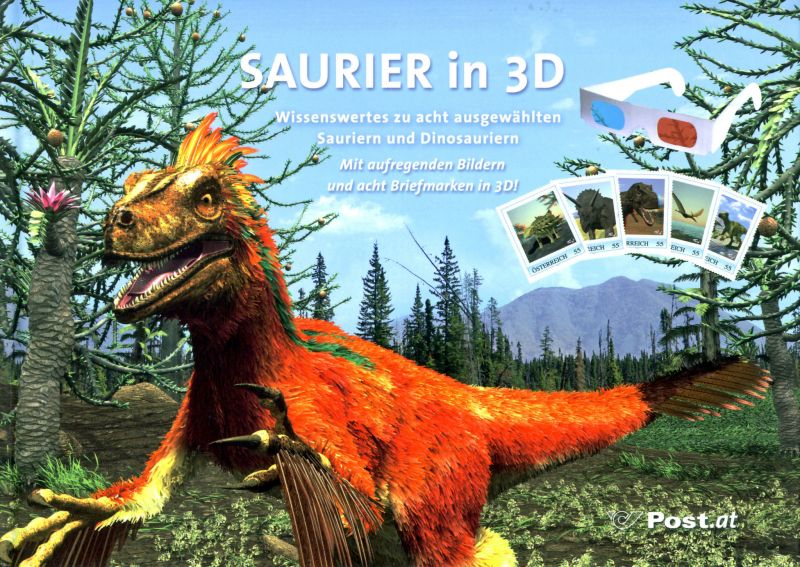 De gegevens over dit zeer interessante boekje voor filatelisten en liefhebbers van dinosauriërs zijn ISBN 978-3-902543-64-6, “Saurier in 3D”, Marlene Schönwetter, Ferrytells Verlag, 2008, 36 pagina’s + 8 originele 3D postzegels. Met deze uitgave heeft de Oostenrijkse Posterijen een tweede 3D-boekje laten produceren en uitgegeven. Het eerste 3D-boekje bevat eveneens een blokje van acht officiële anaglyfenpostzegels. Daarmee hebben zowel de liefhebbers van 3D-plaatjes als de filatelisten zeer leuke informatieve boekjes met mooie 3D-plaatjes.
